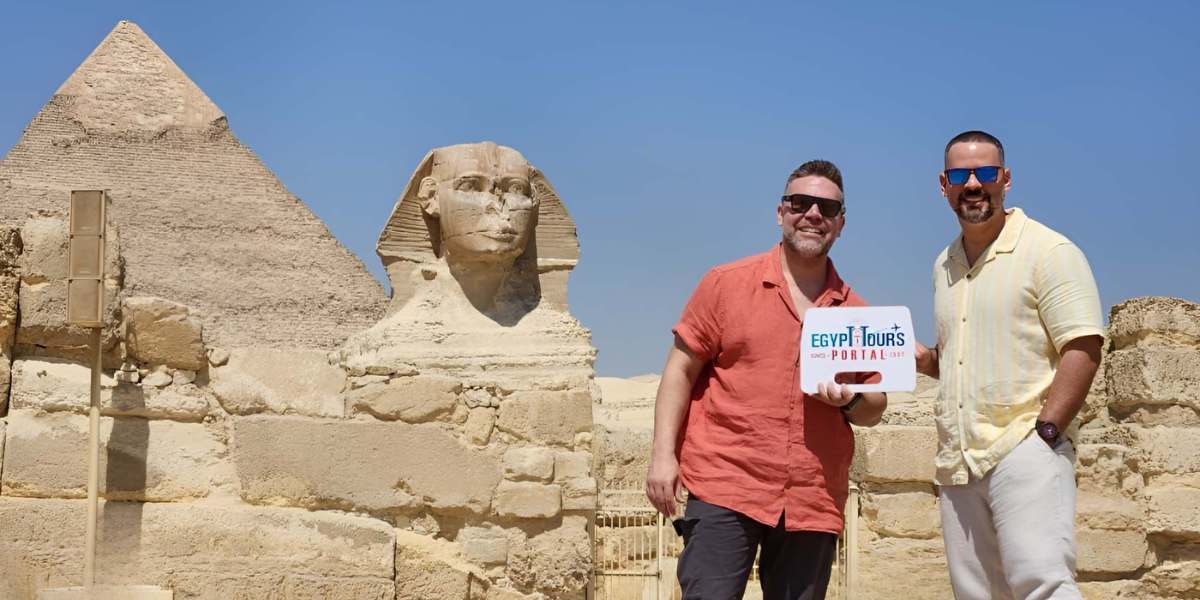 La estatua más antigua de la historia, era la fuente de la inspiración de los incontables viajeros y los poetas hasta la época moderna. Es un Dios egipcio antiguo se llama ''Hor-em-ajet'' que significa Horus en el horizonte, pero hoy se llama ''Abu el Hol'' que significa padre del terror en árabe. Tiene cuerpo de león (símbolo de fuerza) y cabeza humana (símbolo de inteligencia) con la cara del faraón Kefren, el fundador de la segunda pirámide. La Esfinge mide 73 metros de longitud, 20 metros de altura y 19 metros de anchura. Fue esculpida en una pieza sola de piedra caliza.