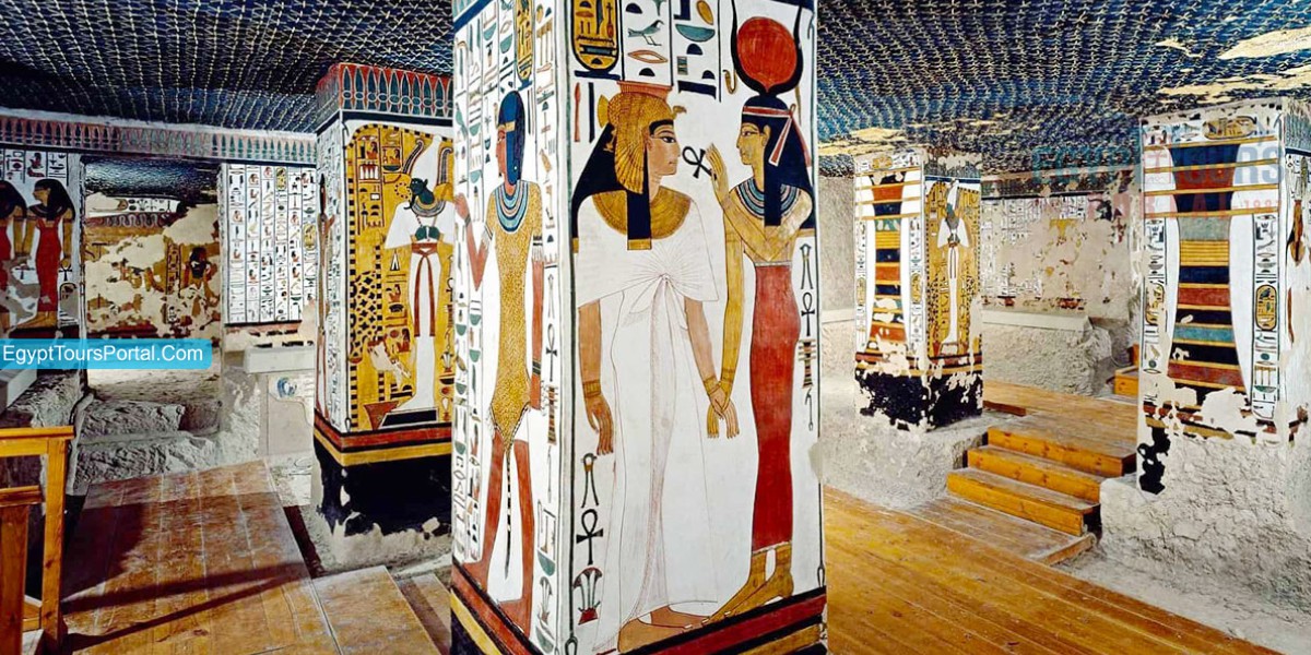 El mágico Valle de las Reinas, morada de las esposas de los faraones, fue construido durante el Reino Nuevo, abarcando las dinastías XVIII, XIX y XX. Atesora 93 tumbas, siendo la más célebre la tumba de la reina Nefertari (1290–1224 a.C.), un verdadero tesoro artístico dedicado a la diosa Hathor, donde el arte egipcio alcanza su máxima expresión.